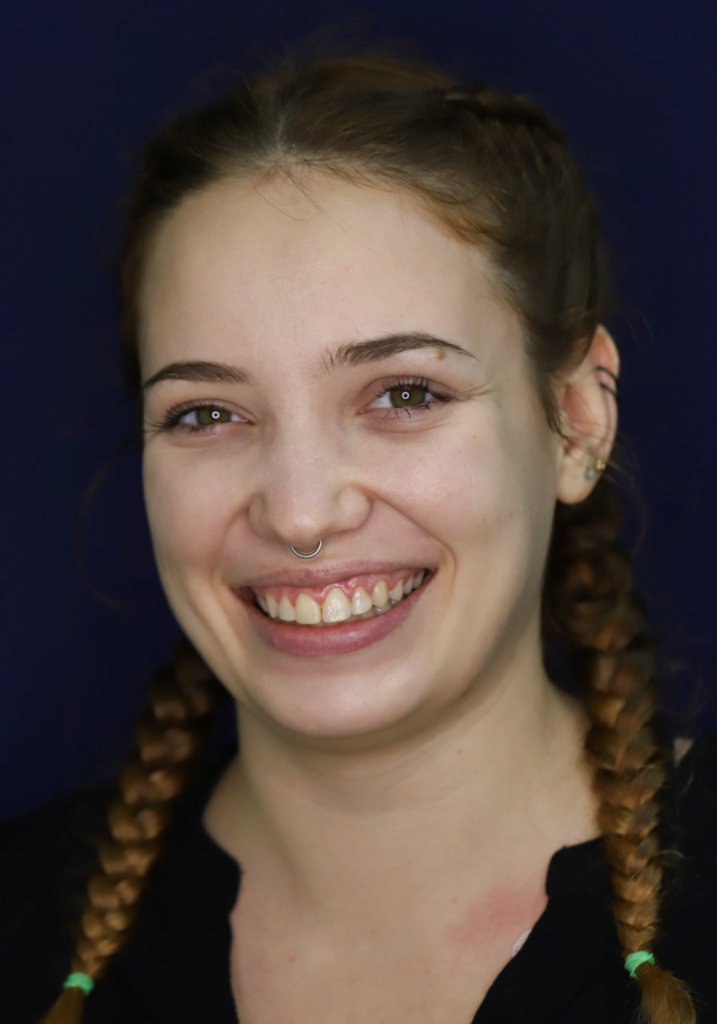 Adri's transformation is a real success story for me. She arrived as a quiet and reserved girl who was very bothered by the condition of her teeth and the large gap between her upper incisors. Her teeth were also traumatized, as a result of which a large piece of the upper incisors broke out, and the size and shape of the small incisors were also not suitable. In the treatment plan, we thought in advance about the final shape of the teeth, the gum contour - which we call pink aesthetics - as well as the adjustment of the bite and the solution to the deep bite. The planning and implementation of similar complex cases is also a great pleasure for me. And the result speaks for itself. :)